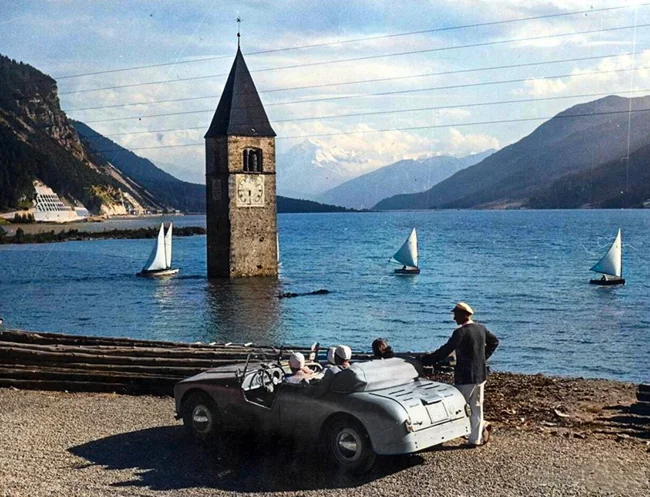 The artificial lake Reschen in South Tyrol, created in 1950 when a dam was built. The bell tower of the old church that stood in the flooded village of Graun rises above the water.