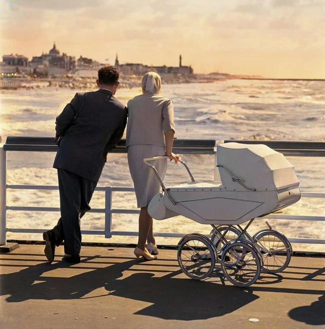 A married couple with a baby carriage in Scheveningen, Netherlands, 1961.