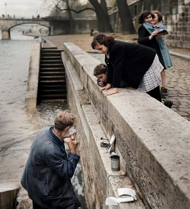 A man shaves on the banks of the Seine. Paris, ca. 1950.