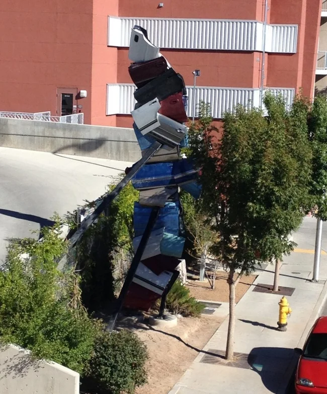 The city of Albuquerque commissioned this piece for $75,000. There is no plaque or information about its creator at the site. The sculpture is located behind trees (perhaps this is the idea - to not immediately understand the idea of a strange bird taking off). Weird? Yes. But given the diversity of contemporary art objects, the auto-hawk is not the worst example.