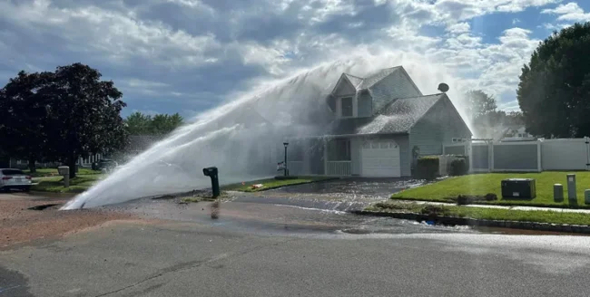 The results of the workers' carelessness were staggering: a huge stream of water gushed from the side of the road and crashed onto the front of a corner home. The stream erupted with such force that it spilled over the roof of the two-story building.
