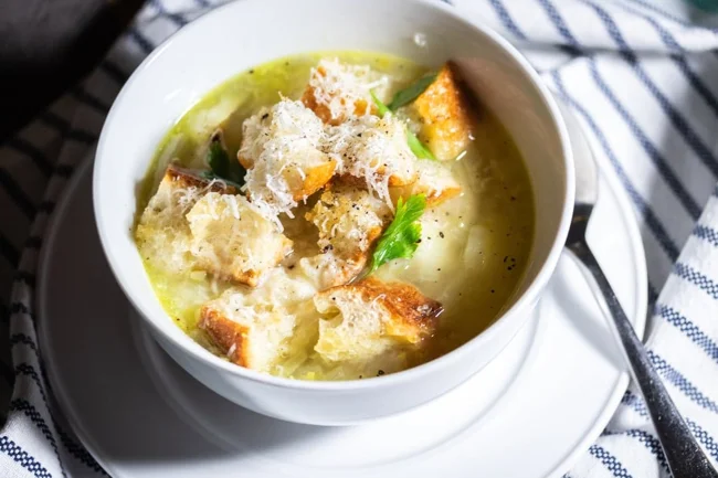 A classic dish prepared on the basis of chicken broth with the addition of potatoes, eggs and a large amount of garlic. As a rule, it is served with croutons.