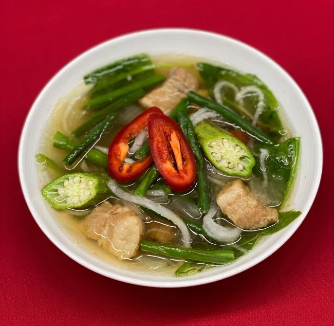 A Filipino soup or stew characterized by a sour and piquant taste, which is achieved by using unripe mango or rice vinegar. Served with rice.