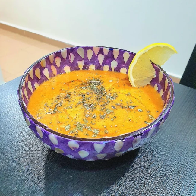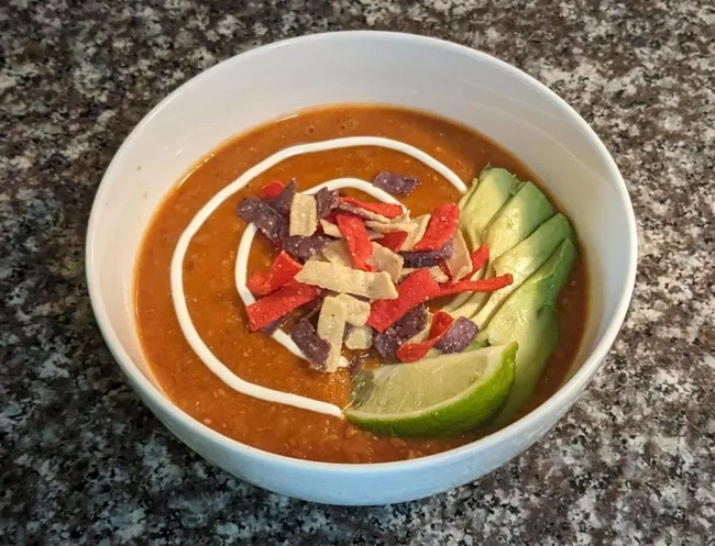 A soup made from bean puree with tomatoes, to which a fairly large amount of chili pepper is added.