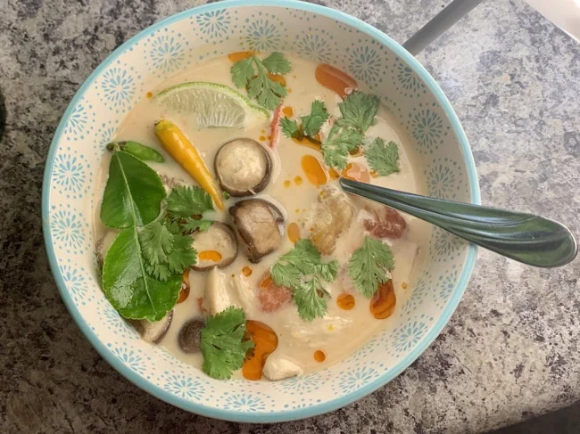 Spicy chicken soup with mushrooms, cooked in coconut milk.