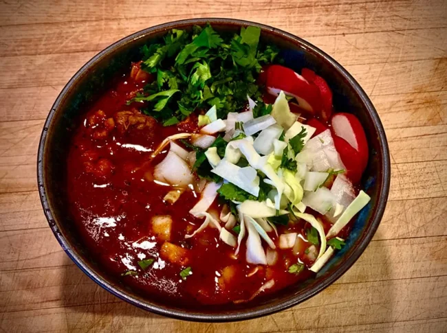 A traditional Mexican soup made from meat and corn. It is thick and filling.
