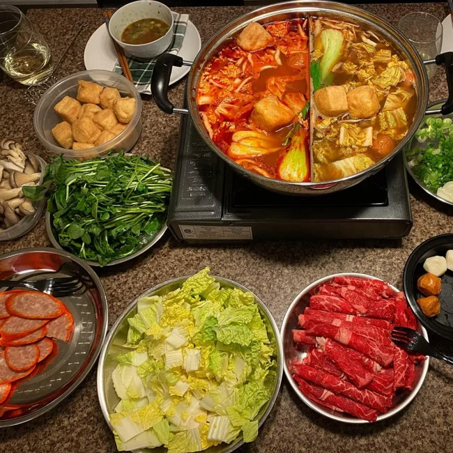 A traditional Chinese dish. It is a boiling (or very hot) broth that is served at the table with various additives. It is intended for large companies. It is an Asian alternative to a buffet.