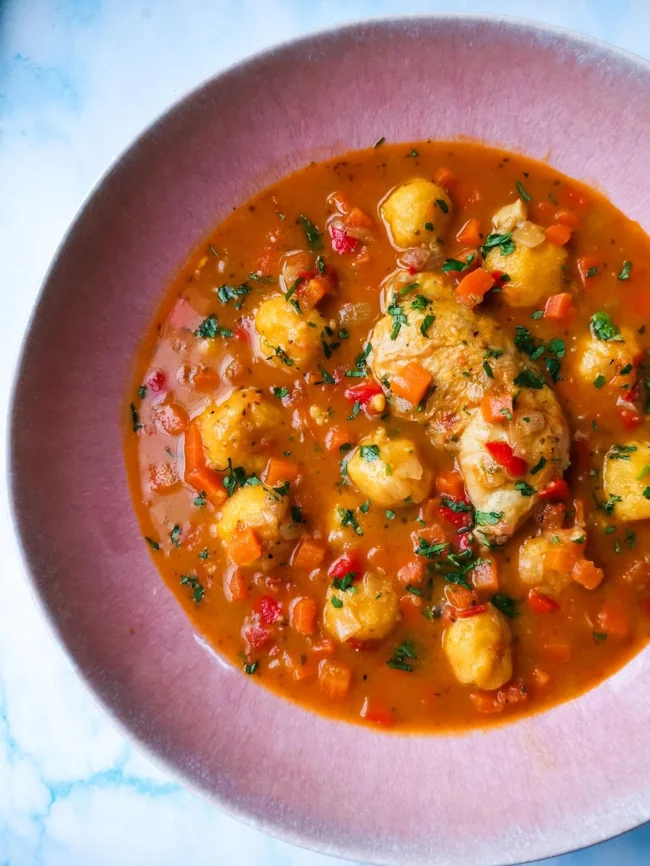 An incredibly tasty and filling soup. It includes meat (usually beef or chicken), large dumplings made from cornmeal and cheese, and vegetables such as carrots, celery, and onions.