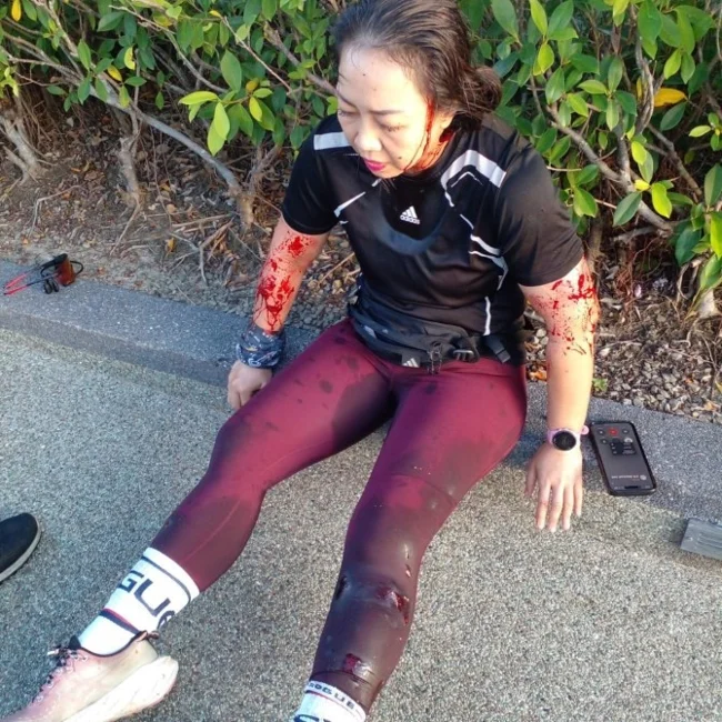 The victim was pictured sitting on the curb in tears, with several deep wounds on her shins. Her arms and legs were covered in blood.