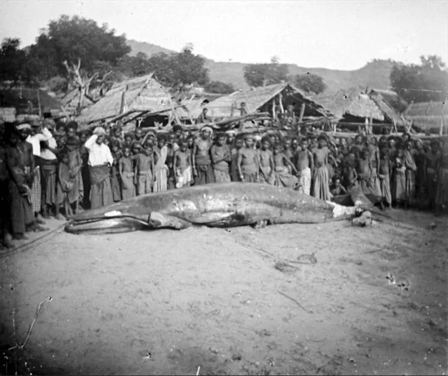 Photo of a baleen whale next to the residents of the village of Lamakera, Indonesia. The photo was taken sometime between 1913 and 1944.