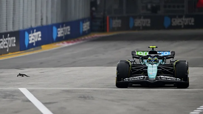 During the final practice session of the Singapore Grand Prix, the brave lizard decided to show the leather ones that he could run no worse than their iron things on wheels, but the humans did not appreciate the reptile's ideas.