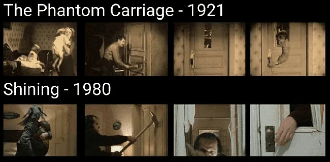 Another detail of the photo that was noticed is 1921. It was in this year that the film "The Phantom Carriage" was released, from which the director borrowed the famous scene with the door being cut down.