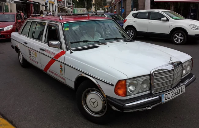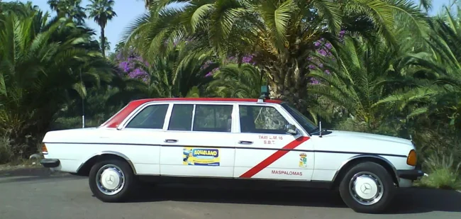 This Mercedes 240D W123 in the extended (6.1 m) seven-seater Lang version works for one of the taxi services of the island of Gran Canaria. Its owner, Domingo, bought the car used in 1988.