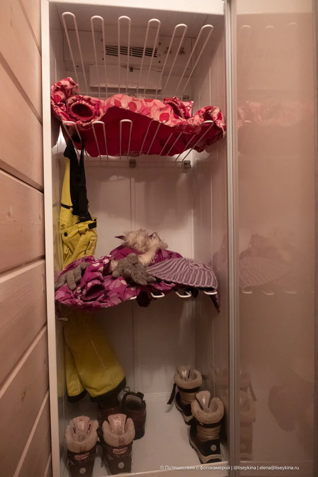 When I rented houses in Finland, there was always a special drying cabinet for clothes in the hallway at the entrance. Very convenient: after rolling in the snow, skiing, snowballs and other winter activities, you don’t look for a place to put your jacket, but just hang it in a special cabinet, which will dry it quickly.