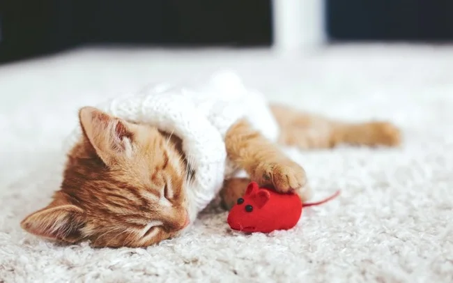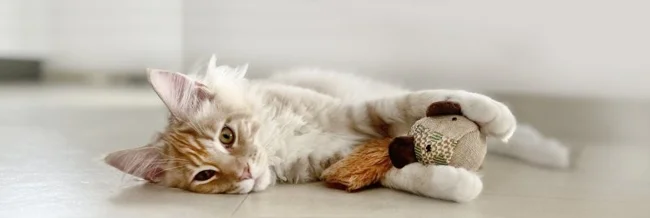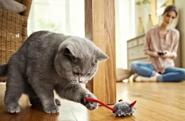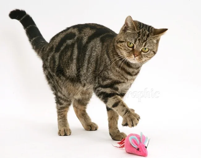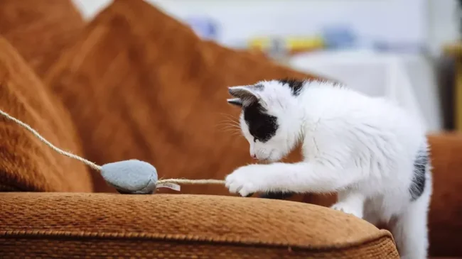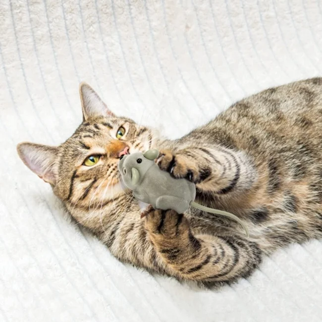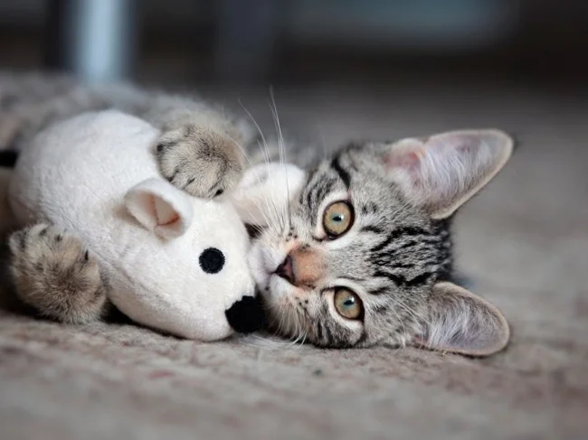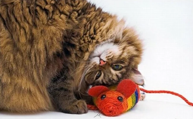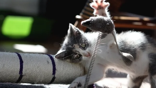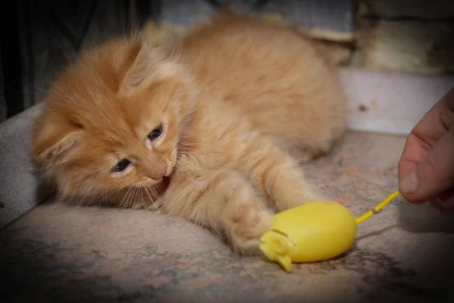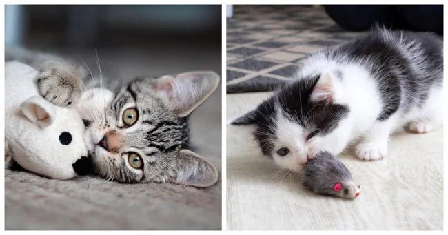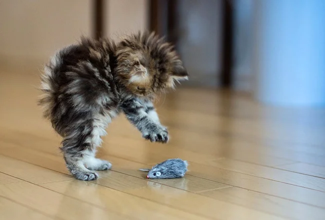 Before learning to catch real prey – live, squeaking and very dangerous, kittens learn on artificial mice.