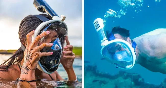This mask was designed to make breathing underwater easy and natural. It allows users to breathe through their nose and mouth underwater, and enjoy an unobstructed 180-degree view.