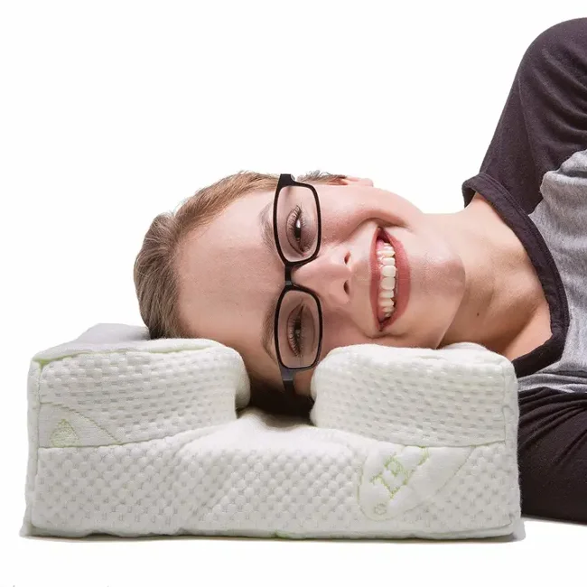 Have you ever laid on a pillow on your side with glasses on? It's not very comfortable. This new pillow features a special hole designed to fit glasses, perfect for watching TV.