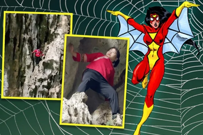 Luo Dengping, a 43-year-old Chinese woman from Jun Miao and Buei in Guizhou Province, is known as the "spider woman" and has amazed people with her incredible ability to climb cliffs over 100 meters high without gloves or safety equipment.