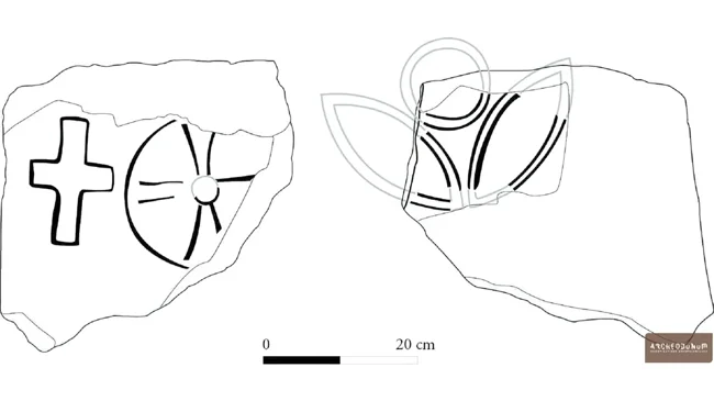 One of the Merovingian sarcophagi was covered by a stone block, which has now fallen apart. It is carved with an emblem in the form of a rosette and two types of crosses.