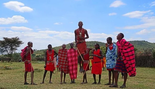 The attire of the Maasai warriors is brightly colored fabrics (shuka) and jewelry that they wear as everyday clothing. The colors of clothing and jewelry have symbolic meaning and reflect important events in a person's life.
