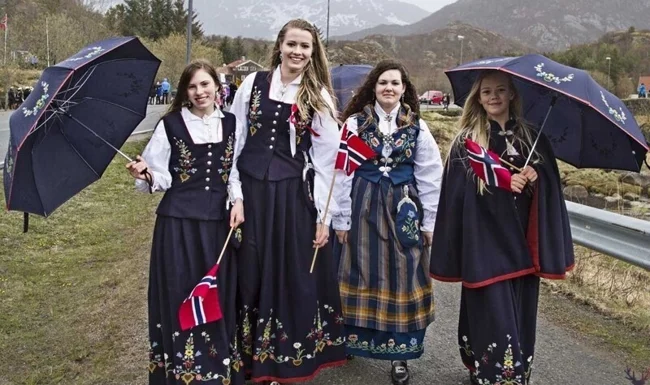 This is a traditional garment that originated in the 18th and 19th centuries as a formal attire. Today, it symbolizes Norwegian identity and patriotism and is worn at weddings and national holidays.