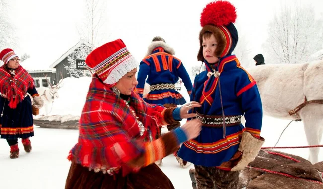 The Sami, the indigenous people of northern Scandinavia, wear "kolt" or "gakti" - brightly colored costumes, often made from reindeer skins. This attire reflects both their connection to nature and the need for protection from the harsh climate. Sami clothing dates back thousands of years and is still worn today, especially during traditional celebrations