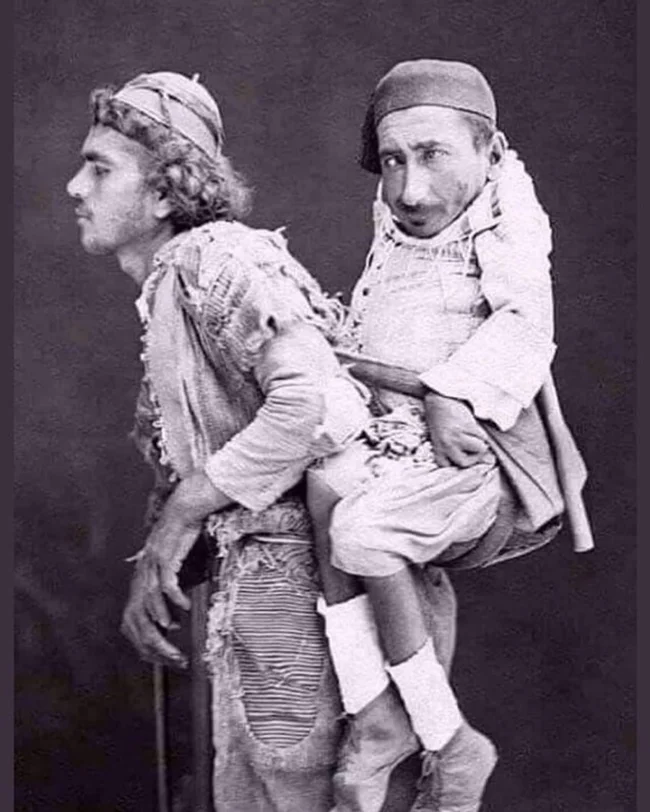 7. A blind Muslim named Muhammad carries his best friend, a paralyzed Christian with dwarfism named Samir, Damascus, 1889