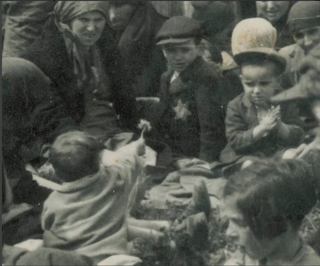 The photo was taken almost 80 years ago, most likely in late May 1944. A small child finds a dandelion in the grass and passes it or shows it to an older boy.