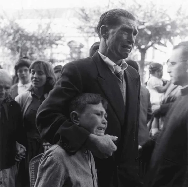 12. A father and son cry as they say goodbye to relatives who are boarding a ship to Buenos Aires in search of a better life during Spain's economic hardships