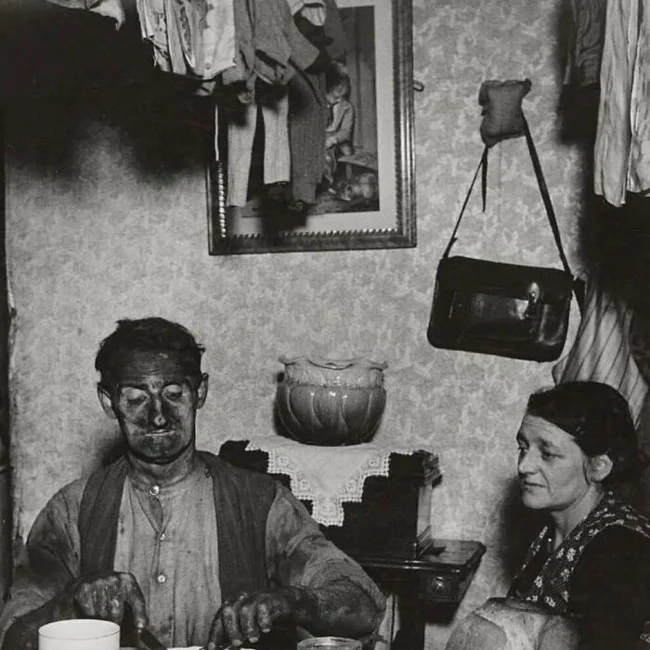 30. An English miner having dinner with his wife after a long day at work, 1937