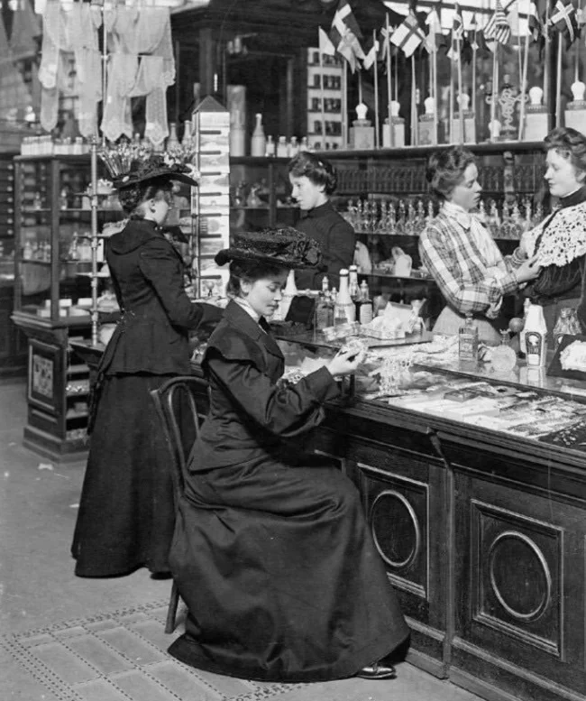 10. Women shopping for cosmetics and jewelry at the Illum department store in Copenhagen, Denmark, 1904 year