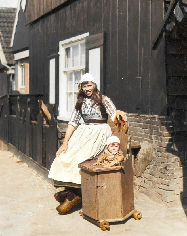 A young Dutch woman with a child in a wooden stroller. The Netherlands, 1929.