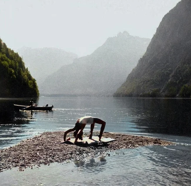 Adolf Hitler's future wife Eva Braun practices yoga on Lake Königssee, Bavaria, Germany, 1942.