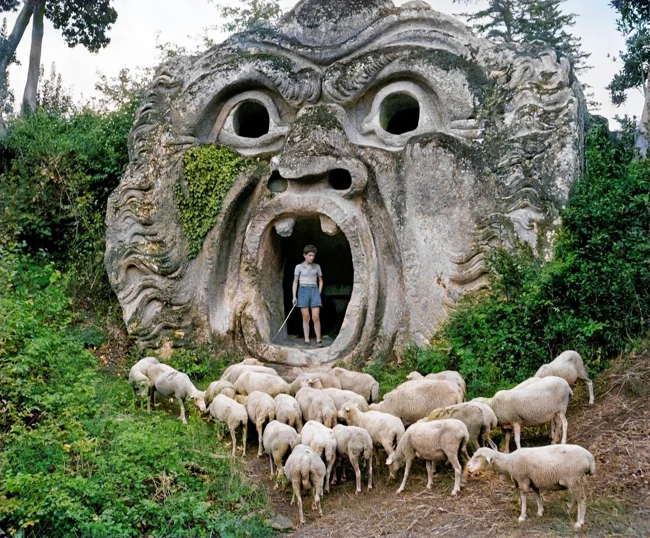 A shepherd with sheep in the "Sacred Grove". Bomarzo, Italy, 1952.