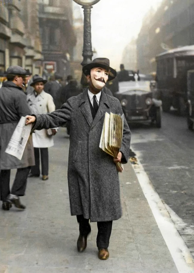 The man is very decently dressed for such a profession, perhaps his business has become a victim of the impending global crisis. That's why he put a mask on his face to hide his identity.