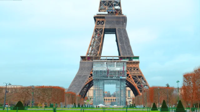 The tower was given a new color before the 2024 Olympics. During the painting, scaffolding was installed that looks as if the Arc de Triomphe had been moved under the tower.