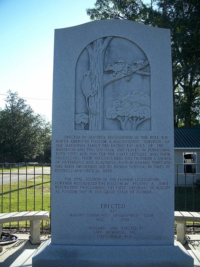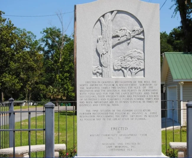 A permanent tribute to the opossum is a 10-foot monument erected in 1982. It is inscribed with the words: "Erected in gratitude for the role played by the North American opossum, a magnificent marsupial that survived into the days of mastodons and dinosaurs, in providing food and fur for the early settlers and their successors. Their presence here provided nutritious food in normal times and was an important aid to human survival in times of adversity and emergency." ![]()