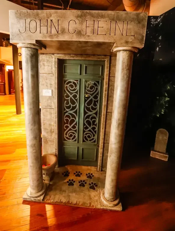 In the early 1980s, vandals opened fire at the cemetery. The bullets damaged part of Stiffy's head and knocked out one of his eyes. Heinl's descendants removed Stiffy from the mausoleum to protect him and donated him to the Historical Society, where he has been housed since 1989.