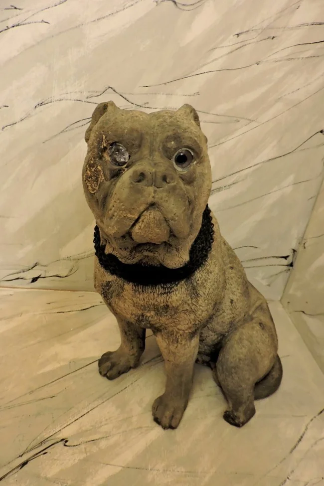 There is a dog living in the Vigo County Historical Society Museum in Indiana. He is a cute bulldog, though he has seen better days. His fur is dusty and matted, and he has one sparkling green glass eye and one cloudy, broken eye.