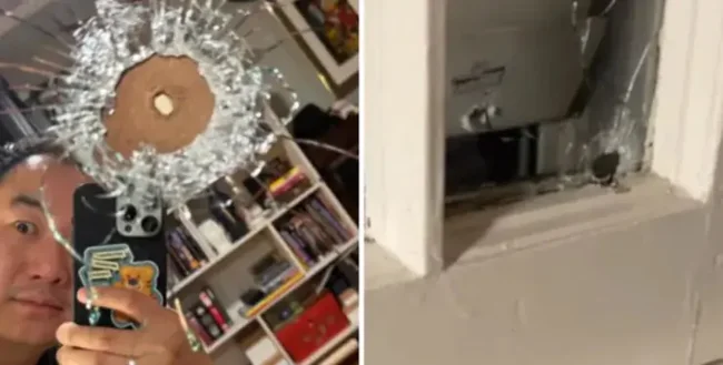 The incident occurred late at night when Daniel was working in his office and heard a loud bang, followed by shards of glass on the floor.