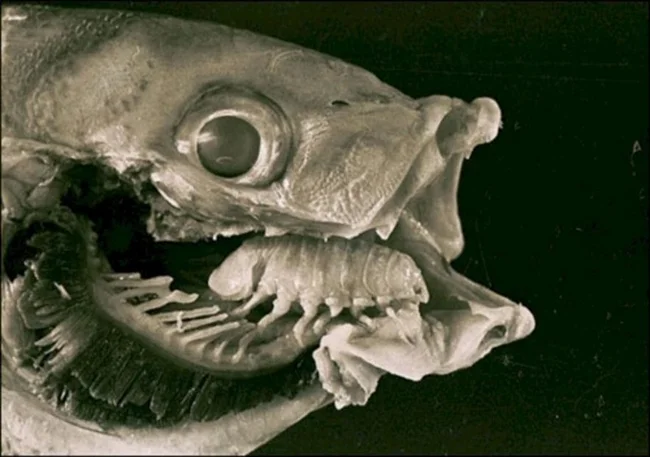 17. This parasite, known as Cymothoa exigua, burrows through a fish's gills, EATS ITS TONGUE, and then TAKES ITS PLACE