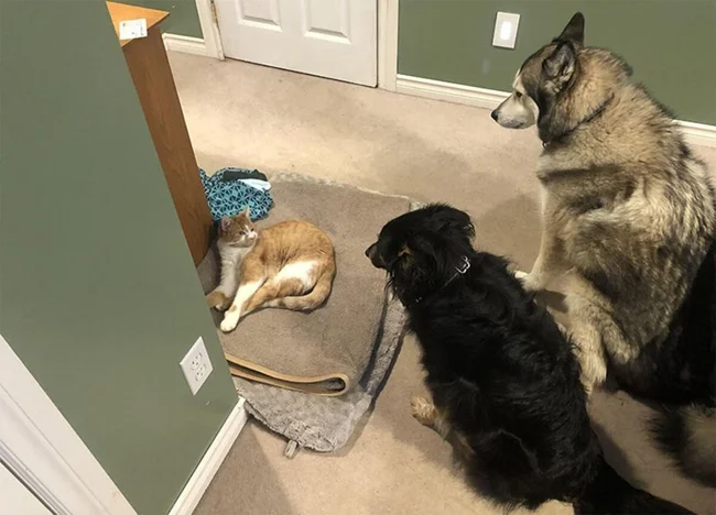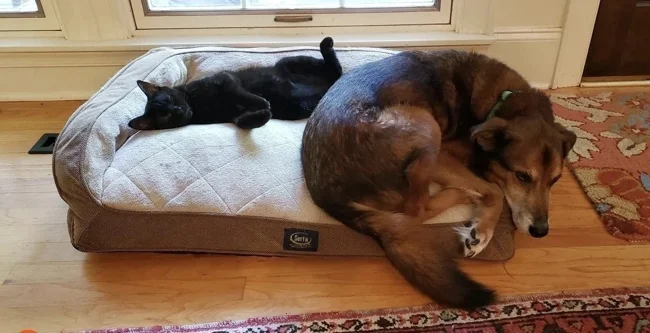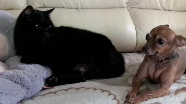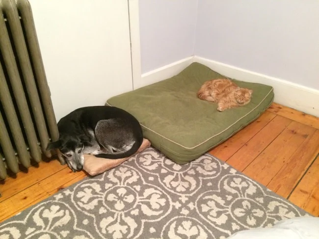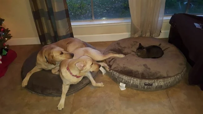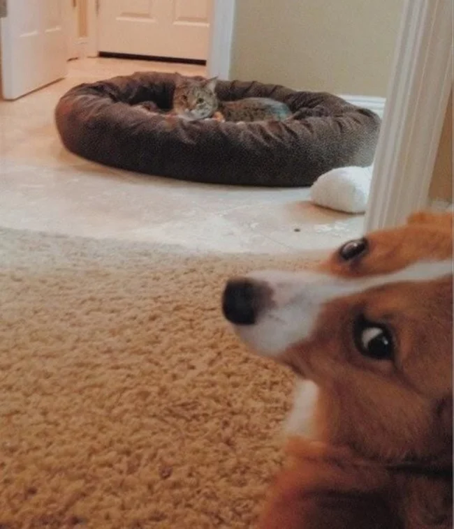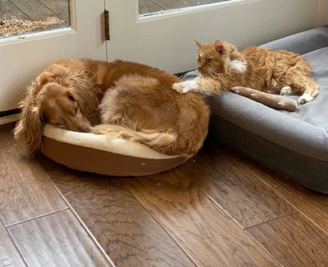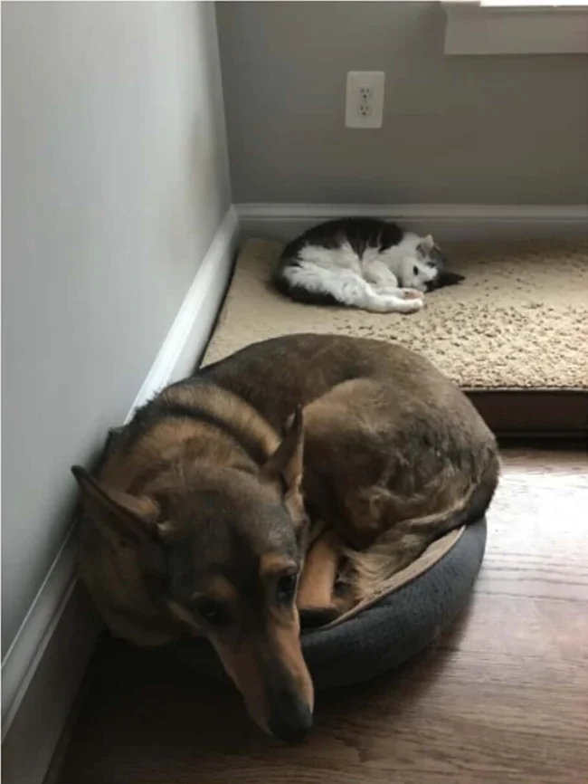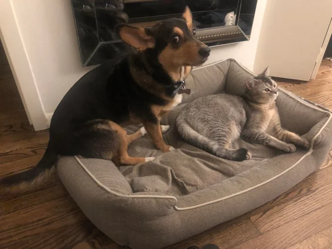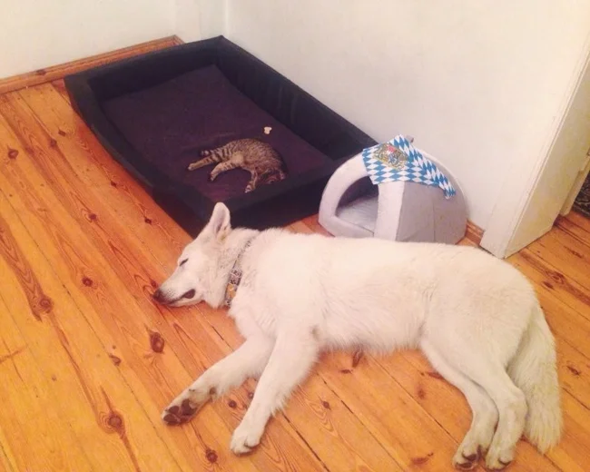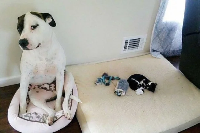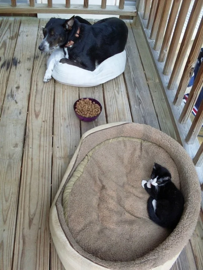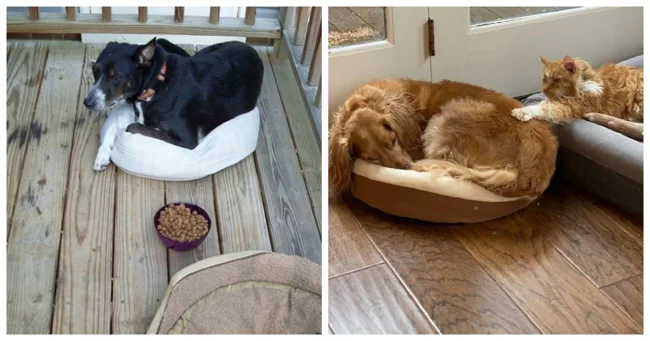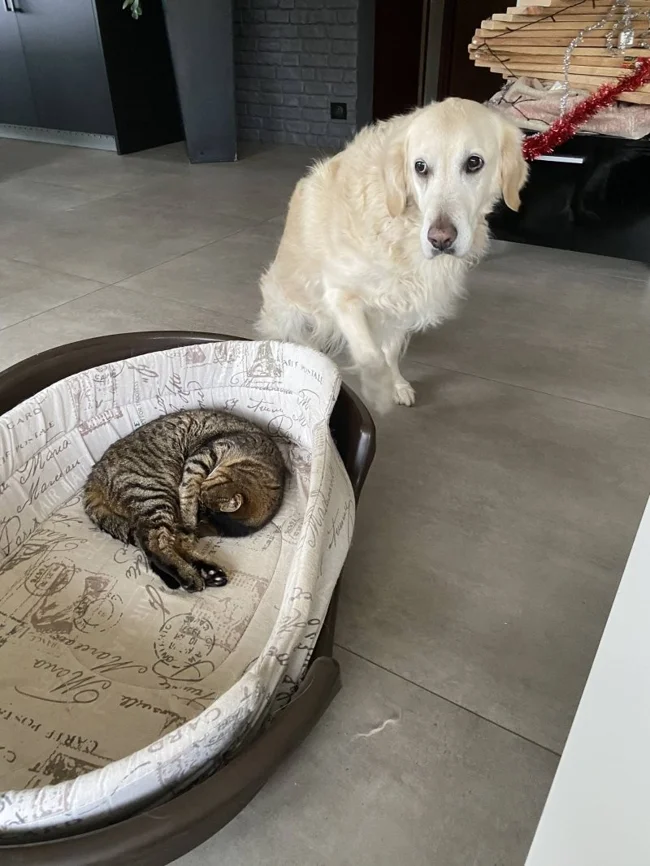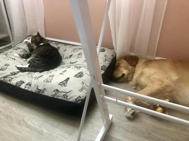 Although owners try to make their pets' lives as comfortable as possible, especially when it comes to sleeping, fights between cats and dogs are quite common.