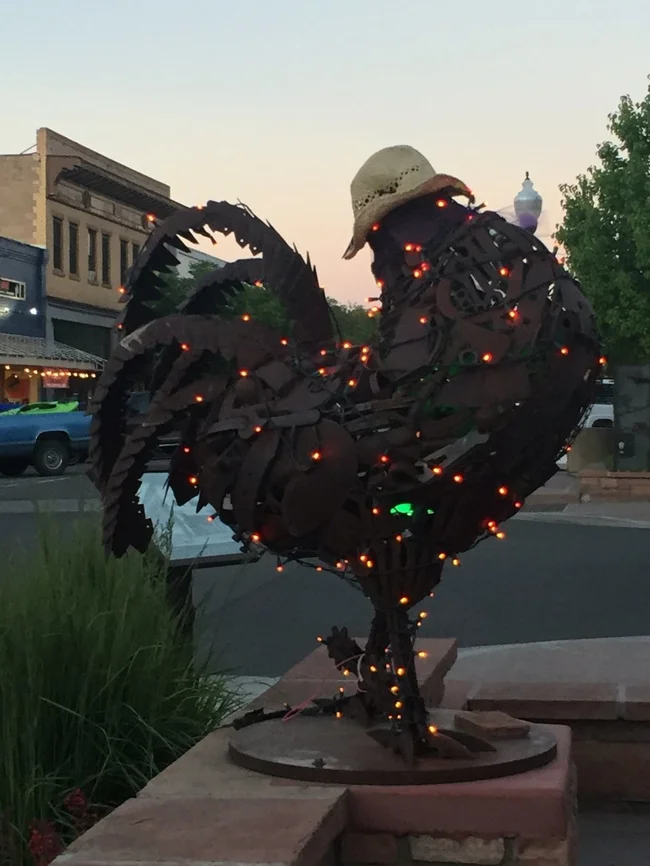 It's easy to walk past this unusual piece of art and not realize that it's a tribute to the strange life of a real chicken, one he lived against his will.