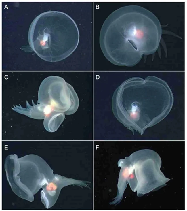 Three parts of the animal are clearly visible: the head, body, and tail. The head is dominated by the oral hood, which is highly elastic. In a relaxed state, the hood has a cup-shaped form with thick muscular walls. The mouth is located at the back of the hood, just below the medial central line (Fig. 2a). The lip of the hood is very flexible, with annular and radial bands of muscle that allow it to close like a sphincter (Fig. 2b), or to close along a vertical axis (Fig. 2c). The most dorsal part of the lip is almost prechenilic; it can reach a peak, forming a protuberance, or invaginate, forming a notch in the edge of the hood (Fig. 2d). The lip can also be folded back onto the outer surface of the bell (Fig. 2e). The hood can be used to propel the animal backwards with a medusoid impulse when flexing (Fig. 2f).