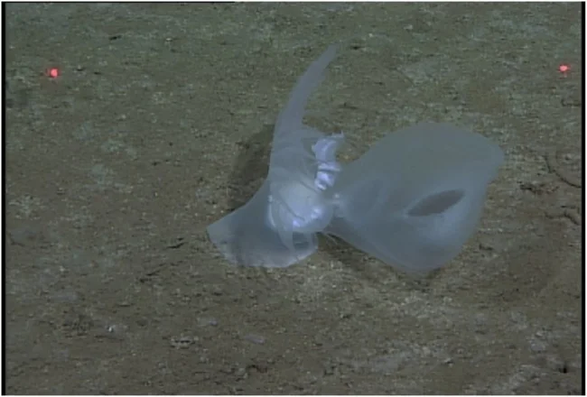 Scientists first spotted the unknown mollusk in February 2000 at a depth of 2,614 meters using a remotely operated vehicle. The creature had a voluminous structure with a hood on one end and a flat tail with finger-like protrusions on the other. The internal organs were brightly colored, making it difficult to identify.