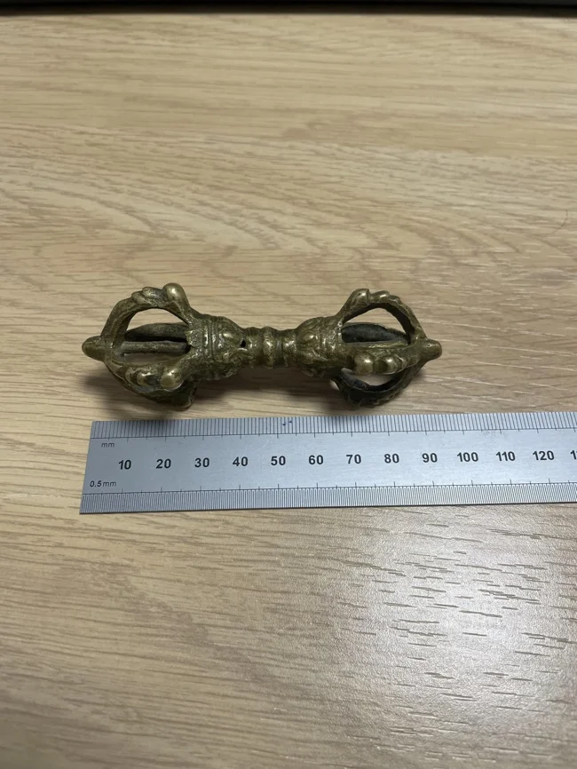 This is a vajra, which means "lightning" in Sanskrit. A ritual and mythological weapon in Hinduism and Buddhism, combining the properties of a sword, mace and spear. Symbolizing, among other things, the masculine principle, the vajra is often used in rituals in tandem with a special bell, a ghanta, which in such cases denotes the feminine principle.