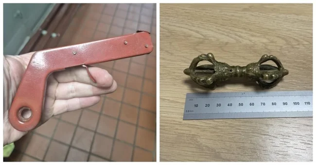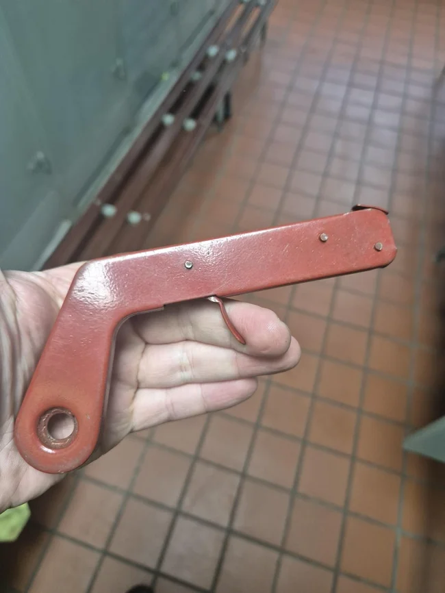 9. A red metal pistol. When you pull the trigger, the spring mechanism inside is triggered, but nothing else happens. Found it in an old work cabinet