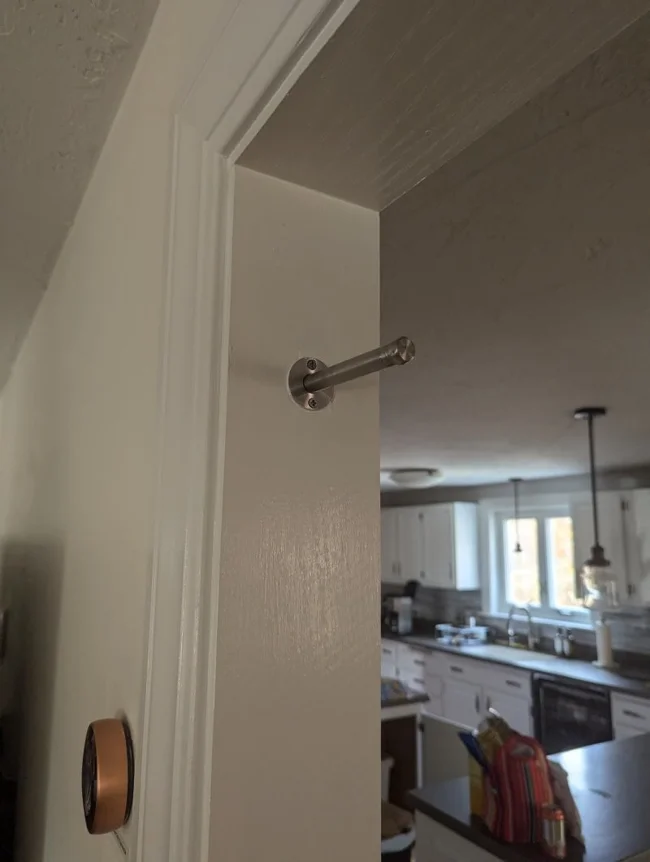 7. Retractable metal rod extending from a solid door frame. It slides out without springs, has a hexagonal shape at the end, but does not screw to anything