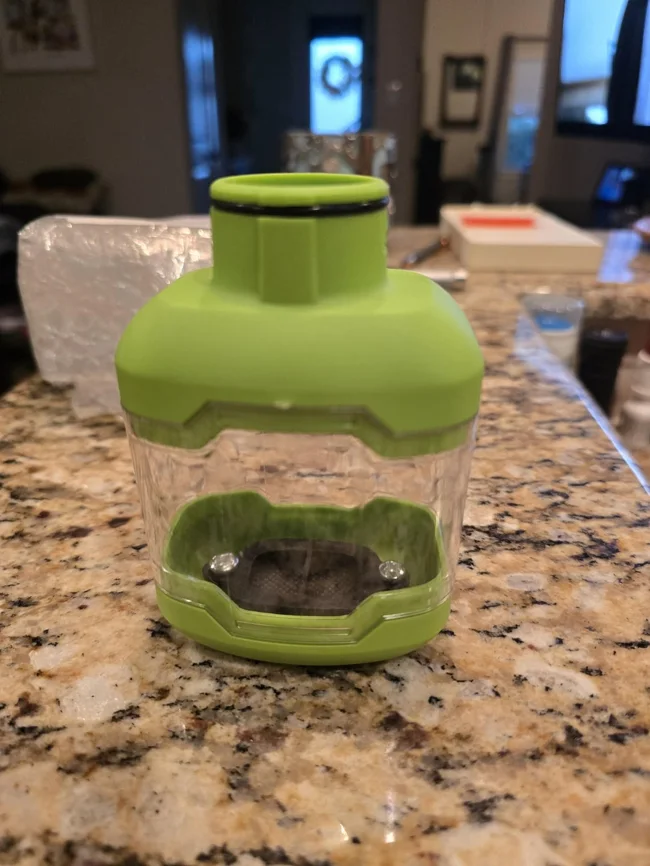 4. A green plastic thing with a mesh filter? It fits comfortably in your hand and weighs almost nothing. It was sent to me from China without any identifying marks