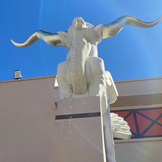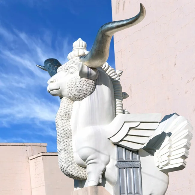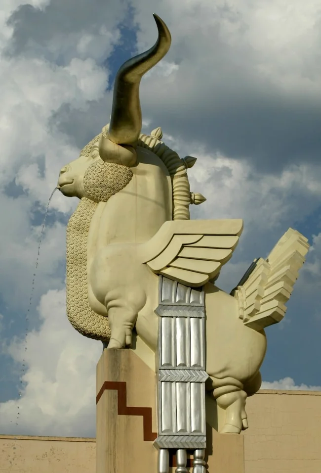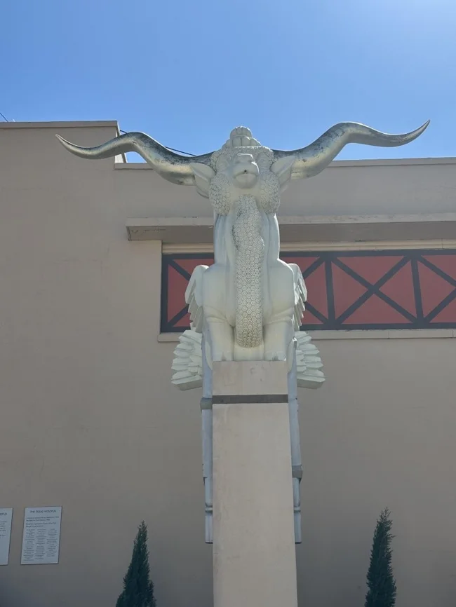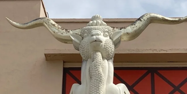 The Texas woofus is a mythological chimera consisting of the main types of Texas cattle. Originally created in 1936 to celebrate the state's centennial for the Dallas Exposition, the Woofus features the mane and neck of a horse, the tail of a turkey, the body of a pig, the wings of a duck, the head of a sheep, and, of course, a pair of impressive horns representing the Texas Longhorns.